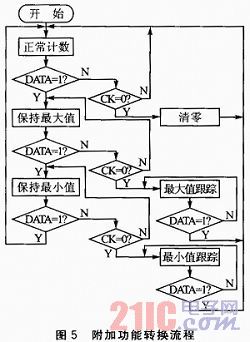 附加功能子程序包括正常計數(shù)、數(shù)據(jù)保持、最大值跟蹤、最小值跟蹤和清零的功能。對附加功能的實現(xiàn)均是通過控制CK和DATA信號線完成,附加功能轉(zhuǎn)換流程如圖5所示。給CK信號線一個負脈沖,即可完成清零操作;在正常計數(shù)狀態(tài)下將DATA信號線置為高電平,容柵傳感器將進入保數(shù)功能;如果再將CK信號線置為低電平,容柵傳感器進入最大值跟蹤功能;內(nèi)部專用芯片將用新測得的數(shù)據(jù)與上一個數(shù)據(jù)進行比較,如果新測得數(shù)據(jù)大,則替換掉,否則丟棄??梢栽谏衔粰C上通過USB測試軟件發(fā)送相關(guān)命令來控制系統(tǒng)進行操作。程序中設(shè)定一個字節(jié)的變量來存放從上位機接收到的命令,當判斷是其中的一個命令時就調(diào)用相應的處理程序完成操作。
