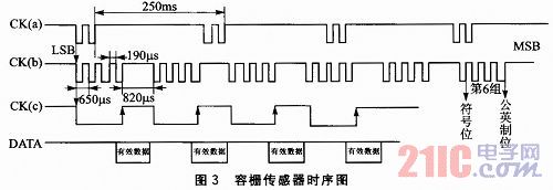 容柵傳感器時序圖如圖3所示。其中包含3個CK信號說明和1個DATA信號說明。CK(a)表示要發(fā)送的完整數(shù)據(jù)間的時序關(guān)系;CK(b)表示一個完整數(shù)據(jù)內(nèi)部各個數(shù)據(jù)組的時序關(guān)系;CK(c)和DATA表示一個數(shù)據(jù)組內(nèi)的時序關(guān)系和對采樣點的說明。由圖可知數(shù)據(jù)每隔250 ms發(fā)送一次,在時鐘CK的上升沿數(shù)據(jù)有效。數(shù)據(jù)由LSB到MSB依次發(fā)送,總共24位二進制數(shù)據(jù),分成6組,每組數(shù)據(jù)間隔820μs。其中前5組為數(shù)據(jù)位,第6組為控制位組(包含符號位和公英制位),控制位組的第0位的“0”表示正數(shù),“1”表示負數(shù),第3位“0”表示公制單位mm,最小單位0.01 mm,“1”表示英制單位inch,最小單位0.000 5 inch,x表示無效。為了能夠?qū)崟r采集數(shù)據(jù),采用中斷方式檢測CK信號,邊沿觸發(fā)。檢測CK信號的高電平持續(xù)超過820μs時,當出現(xiàn)下降沿時觸發(fā)中斷,進入中斷程序,再持續(xù)檢測低電平直到出現(xiàn)上升沿,讀取DATA信號電平并存儲,總共采集24位。返回主函數(shù)根據(jù)符號位和公英制位進行相應處理。相關(guān)程序代碼如下: