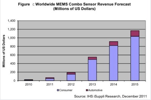 據(jù)IHS iSuppli公司的MEMS市場(chǎng)簡(jiǎn)報(bào),基于MEMS的多傳感器封裝,即所謂的“組合”傳感器,將在消費(fèi)應(yīng)用與汽車(chē)應(yīng)用領(lǐng)域具有非常光明的前景,未來(lái)五年在這兩個(gè)領(lǐng)域的合計(jì)銷(xiāo)售額將增長(zhǎng)到現(xiàn)在的50倍。
