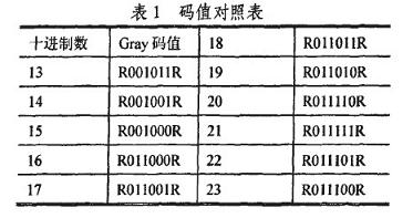 編碼采用格雷碼(Gray)為數(shù)值碼,以某一固定碼寬為參考碼R,它用于標(biāo)尺定位和提高精度。Gray碼是一種絕對(duì)編碼方式的無權(quán)碼,它所具有的循環(huán)、單步特性能消除隨機(jī)取數(shù)時(shí)出現(xiàn)重大誤差的可能,其任意兩個(gè)柏鄰整數(shù)之間轉(zhuǎn)換時(shí),只有一個(gè)位數(shù)發(fā)生變化,大大減少了由一個(gè)狀態(tài)轉(zhuǎn)到下一個(gè)狀態(tài)時(shí)的邏輯混淆,具有較強(qiáng)的容錯(cuò)能力。以6位編碼為例,其部分十進(jìn)制數(shù)與Gray碼的一一對(duì)應(yīng)關(guān)系如表1所示。