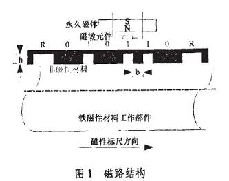 采用圖1所示的測(cè)量結(jié)構(gòu),其中被測(cè)工作部件要求屬于鐵磁性材料。文獻(xiàn)中指出在固定的磁場(chǎng)中,表面變化的曲率越大,引起的周圍磁場(chǎng),變化也越大。為了使磁場(chǎng)的影響最大,選用凹槽作為測(cè)罩標(biāo)志,以單位寬度(bmm)的凹槽表示“0”或碼元間隔,單能寬度的“凸槽”表示“1”,兩倍單位寬度的“凸槽”表示標(biāo)志位R。在工作部件表面,按上述的編碼規(guī)則加下出一系列凹槽,然后噴涂上非磁性材料,形成磁性標(biāo)尺。圖1所示的磁性標(biāo)尺表示Gray碼01 1010碼區(qū),黑色部分表示非磁性材料。