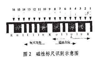 根據(jù)磁敏傳感原理,“凹槽”和“凸槽“會(huì)導(dǎo)致不同的磁場(chǎng)強(qiáng)度,從而使磁敏元件相應(yīng)地輸出不同的電半信號(hào)“0”或“1”,形成數(shù)值碼,用于確定位移的粗讀值;而標(biāo)志位R碼寬兩倍于碼元“1”寬度的特點(diǎn),使得識(shí)別后的序列出現(xiàn)具有固定特征的標(biāo)識(shí)碼,它用于精讀數(shù)。