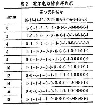 霍爾電路的工作原理是,在外磁場(chǎng)的作用下,當(dāng)磁感應(yīng)強(qiáng)度B超過導(dǎo)通工作點(diǎn)時(shí),霍爾電路輸出管導(dǎo)通,輸出低電-半:若曰值低于釋放點(diǎn)時(shí),輸出管截止,輸出高電半。因此在“凸槽”時(shí)鋼質(zhì)活塞桿被磁化,磁感應(yīng)強(qiáng)度曰增加,霍爾電路導(dǎo)通,輸出低電平,用“1”表示;在“凹槽”時(shí)輸出高電平,用“0”表示。以第1個(gè)霍爾元件為測(cè)量基準(zhǔn),從圖2所示時(shí)刻起,位移暈旃次變化b=2mm時(shí),一個(gè)碼區(qū)行程內(nèi)霍爾電路輸出的二進(jìn)制序列如表2所示。分析可知,序列的標(biāo)識(shí)碼為l 0000000 1,其前面或后面6位序列數(shù)分別為相鄰的兩個(gè)數(shù)值碼,這使它具有很強(qiáng)的容錯(cuò)能力。標(biāo)識(shí)碼每隔一個(gè)霍爾元件間距N在低位部分右移一位。值得注意的是,標(biāo)識(shí)碼前面的數(shù)值碼代表磁性標(biāo)尺當(dāng)前檢測(cè)位置下一個(gè)碼區(qū)的值。