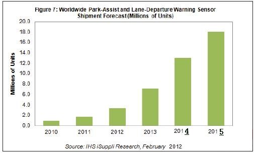泊車輔助攝像頭與車道偏離警告攝像頭,只是將出現(xiàn)在自動駕駛應(yīng)用中的傳感器中的兩類,未來五年預(yù)計每年都會強勁增長。這類傳感器2012年出貨量預(yù)計將達(dá)340萬個,是去年170萬個的兩倍,到2015年將達(dá)到1800萬個左右,幾乎是2010年939200個的20倍,如圖所示。