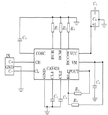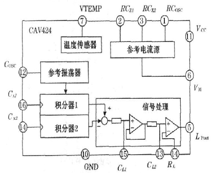 CAV424是專門用于電容檢測轉(zhuǎn)換的集成芯片, 其工作原理圖及外圍連接圖如圖1所示。