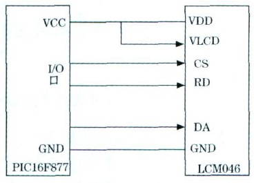 控制顯示電路以單片機(jī)為核心, 選用PIC16F877單片機(jī)為控制器, 其內(nèi)部含有10位高精度A /D轉(zhuǎn)化器, 能夠直接處理模擬電壓, 調(diào)整CAV424的GLP , 可以使輸出電壓范圍在2 5~ 35V 之間, 滿足單片處理信號的要求。顯示器件選用LCM 046液晶模塊, 其功耗低, 工作電流只有μA級, 并且其與處理器連接簡單。連接圖如圖4所示。
