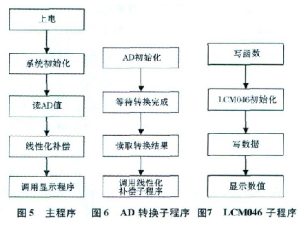 軟件設(shè)計主要包括A /D 轉(zhuǎn)換程序和LCM 046 數(shù)據(jù)顯示兩部分。另外還有非線性補償部分, 在線性不好的情況下可以采用插值法進(jìn)行必要的線性補償。軟件流程圖設(shè)計如圖5、圖6、圖7所示。