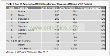 據(jù)IHS iSuppli公司的汽車MEMS報告,德國博世2011年是全球最大的汽車MEMS器件生產(chǎn)商,憑借自己的優(yōu)勢地位和高于產(chǎn)業(yè)平均水平的增長速度,其營業(yè)收入實現(xiàn)增長。