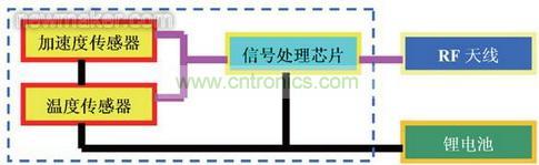新一代DTPMS將MEMS的加速度傳感器和溫度傳感器與信號處理電路集成在一塊芯片中。傳感器模塊的構(gòu)成部件有集成MEMS傳感器和信號處理電路的胎壓監(jiān)測器芯片、電池以及向本車駕駛臺傳輸計(jì)測結(jié)果的天線這三個(gè)部分,如圖1所示。由此使得內(nèi)置傳感器模塊的重量大大降低,先前安裝在輪胎氣門嘴上的已有傳感器模塊重量原為1個(gè)37g,而新一代DTPMS粘貼在輪胎上的模塊重量僅為11g。其電池壽命可達(dá)到與輪胎一樣的6年。
