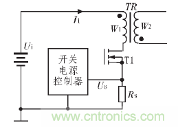 開關(guān)電源從控制方式上可分為電壓控制型和電流控制型,從隔離變壓器的驅(qū)動方式上可分為單端型和雙端型。在這些電路形式中, 許多形式的開關(guān)電源需要使用電流傳感器檢測電流,或者用于脈沖占空比的控制,或者用于電路的保護(hù)。電流控制型開關(guān)電源直接對輸入的脈沖電流進(jìn)行檢測,能同時根據(jù)輸入電壓和輸出電壓的變化綜合調(diào)節(jié)脈沖占空比,具有動態(tài)響應(yīng)速度快,輸入電壓的波動對輸出電壓影響小等特點。電流控制型開關(guān)電源中需要電流傳感器檢測輸入的脈沖電流, 以作為開關(guān)電源調(diào)節(jié)脈沖占空比、穩(wěn)定輸出電壓的反饋信號。圖1 所示為一個電流控制型的反激式開關(guān)電源的輸入通道原理圖。圖中電阻RS在電路中的作用即是電流傳感器, 在功率開關(guān)T1導(dǎo)通時, 流過隔離變壓器原邊繞組W1的電流Ii將使RS上產(chǎn)生電壓降US,US即為向開關(guān)電源控制器反饋的輸入電流值信號。根據(jù)輸出電壓反饋信號和輸入電流值反饋信號US, 開關(guān)電源控制器將綜合調(diào)節(jié)電路的脈沖占空比,保證輸出電壓的穩(wěn)定。