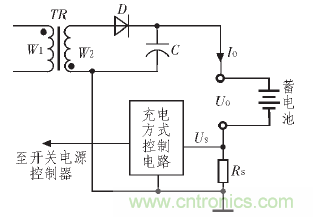 為了提高開關(guān)電源工作的可靠性,防止輸出電流過流等情況發(fā)生,許多開關(guān)電源在輸出端接入電流傳感器,檢測輸出電流的大小,一旦輸出電流超過設(shè)計標(biāo)準(zhǔn),保護(hù)電路即采取必要措施保護(hù)開關(guān)電源的安全[3]。此外,當(dāng)開關(guān)電源作為蓄電池充電器時,也需要檢測輸出電流的大小,以此了解蓄電池的充電情況,適時切換充電方式,達(dá)到提高充電效率,延長蓄電池的使用壽命的效果。圖3 為一個蓄電池充電器的輸出電流檢測原理圖, 電流檢測電阻RS將蓄電池的充電電流轉(zhuǎn)化為電壓US,反饋給充電方式控制電路,由控制電路根據(jù)充電電流的大小適時切換充電方式[4]。