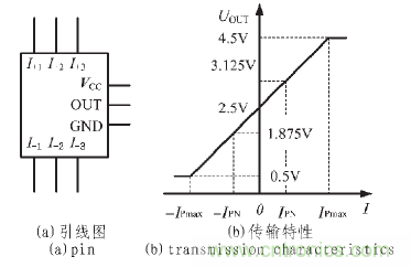 常用的TBC-DS 系列閉環(huán)霍爾電流傳感器的引線框圖和傳輸特性如圖5 所示[6]。圖5(a)所示的霍爾電流傳感器引線中,I+1~3和I-1~3是被測電流的串入繞組引腳, 其中,I+1和I-1是一個被測電流繞組的引腳,I+2和I-2、I+3和I-3也分別各是一個被測電流繞組的引腳。當(dāng)3 個被測電流繞組并聯(lián)時,霍爾電流傳感器的額定測量電流為IPN1; 若將兩個繞組并聯(lián)再與一個繞組串聯(lián)時,霍爾電流傳感器的額定測量電流為IPN2;若將3 個繞組相互串聯(lián)時,霍爾電流傳感器的額定測量電流為IPN3。3 個額定測量電流間的關(guān)系為:IPN1=2 IPN2=3 IPN3??梢?,通過3 組被測電流繞組的不同接法,可以改變霍爾電流傳感器的額定測量電流值,擴(kuò)展測量區(qū)間。VCC為電源引腳,電源電壓通常為5 V;GND 是電源和傳感器輸出電壓的地;OUT 是傳感器電壓輸出引腳。由5(b)所示的霍爾電流傳感器傳輸特性可見,當(dāng)被測電流為0 時,其輸出電壓UOUT =2.5 V;當(dāng)被測電流不為0 且方向為從I+至I-時,輸出電壓UOUT>2.5 V,當(dāng)被測電流不為0 且方向為從I-至I+時,輸出電壓UOUT<2.5 V。IPN和-IPN是霍爾傳感器的正負(fù)額定電流, 當(dāng)被檢測電流達(dá)到額定電流時,根據(jù)電流方向的不同,輸出電壓UOUT 的值分別為3.125 V 或1.875 V, 即相對于2.5 V 的中心值有±0.625 V的偏移。當(dāng)被檢測電流值絕對值大于IPN 時,霍爾傳感器仍可輸出與被檢測電流成線性關(guān)系的電壓值,直至被檢測電流達(dá)到霍爾傳感器的最大檢測電流IPmax。通常,IPmax>3 IPN。