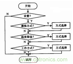 可設(shè)置的參數(shù)主要有,播報(bào)方式:“連續(xù)、隔x秒、禁止”;報(bào)警溫度值;工作方式等。在需要實(shí)時(shí)關(guān)注溫度值的時(shí)候,可以設(shè)置為連續(xù)播報(bào);溫度變化較慢的時(shí)候可以設(shè)置為隔x秒方式;夜晚設(shè)置報(bào)警模式后,可以設(shè)置為禁止播報(bào)模式。設(shè)置報(bào)警溫度值后可以,可以處理其他事情,在出現(xiàn)警情時(shí),系統(tǒng)給出報(bào)警,提示用戶。選擇工作方式為“聯(lián)網(wǎng)工作”后,系統(tǒng)除了現(xiàn)場(chǎng)播報(bào)和報(bào)警外,還將相應(yīng)信息通過(guò)異步串行口發(fā)送到遠(yuǎn)端。設(shè)置過(guò)程全部采用語(yǔ)音菜單方式,可以大幅度較低成本,設(shè)置流程圖如圖2所示。