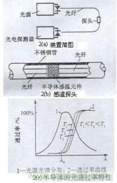 位圖2(a)為半導(dǎo)體吸光型(傳光型)光纖溫度傳感器示意圖。將一根切斷的光導(dǎo)纖維裝在細鋼管內(nèi),光纖兩端面間夾有一塊半導(dǎo)體感溫薄片(如GaAs或InP),這種半導(dǎo)體感溫薄片透射光強隨被測溫度而變化。因此,當(dāng)光纖一端輸入一恒定光強的光時,由于半導(dǎo)體感溫薄片透射能力隨溫度變化,光纖另一端接收元件所接受的光強也隨被測溫度而改變。于是通過測量光探測器輸出的電量,便能遙測到感溫探頭2(b)處的溫度。