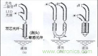 光纖液位傳感器的工作原理如圖3(b)所示。發(fā)光器件射出來的光通過傳輸光纖送到敏感元件,在敏感元件的球面上,有一部分透過,而其余的光被反射回來。當(dāng)敏感元件與液體相接觸時,與空氣接觸相比,球面部的光透射量增大,而反射量減少。因此,由反射光量即可知道敏感元件是否接觸液體。反射光量決定于敏感元件玻璃的折射率和被測定物質(zhì)的折射率。被測物質(zhì)的折射率越大,反射光量越小。來自敏感元件的反射光,通過傳輸光纖由受光器件的光電晶體管進行光電轉(zhuǎn)換后輸出。敏感元件的反射光量的變化,若以空氣的光量為基準,在水中則為-6-—7dB,在油中為-25—30dB。可對反射光量差別很大的水和油等進行物質(zhì)判別。