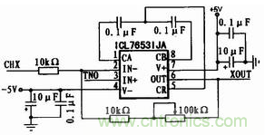 信號(hào)放大電路采用ICL7653斬波穩(wěn)零運(yùn)算放大器來(lái) 完成,如圖2所示。ICL7653具有極低的失調(diào)電壓和偏置電流,具有較高的工作穩(wěn)定性和優(yōu)良的高精度放大功能。ICL7653斬波穩(wěn)零使用內(nèi)部時(shí)鐘時(shí), 在CA、CB與CR端之間加上0.1 μF的低泄放、高穩(wěn)定性的聚酯或聚丙烯電容。同時(shí)在雙電源接入端進(jìn)行濾波和去耦處理。