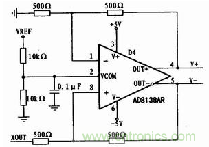 如圖3所示,差分轉(zhuǎn)換電路以AD8138AR為核心,將單端信號(hào)轉(zhuǎn)換差分信號(hào),既可以提高共 模抑制比,有效減小共模信號(hào)影響,又可以驅(qū)動(dòng)SOC內(nèi)部的24位差分Sigma-Delta模/數(shù)轉(zhuǎn)換器。AD8138AR具有較寬的模擬帶寬(320 MHz,-3 dB。增益為1時(shí)),而且AD8138AR為表面封裝器件,器件體積小,使得ADC與信號(hào)輸入點(diǎn)的距離可以很近,大大減少了外界噪聲的影響。