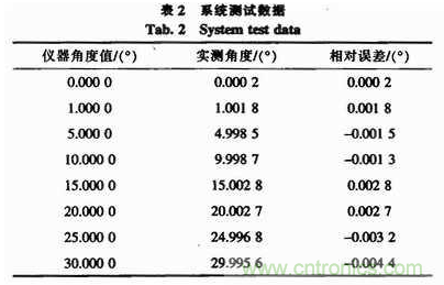 該傾角測(cè)量系統(tǒng)在MC019-JJ2數(shù)字式2"光學(xué)分度頭標(biāo)準(zhǔn)儀器上進(jìn)行了分度和性能測(cè)試。MC019-JJ2數(shù)字式2"光學(xué)分度頭是一種對(duì)裝夾在其主軸上的工件進(jìn)行角度分度或進(jìn)行角度檢驗(yàn)的精密光學(xué)計(jì)量?jī)x器,其顯示當(dāng)量為1"。測(cè)試數(shù)據(jù)如表2所示。