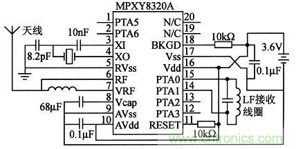檢測(cè)模塊由胎壓測(cè)量專(zhuān)用高集成芯片MPXY8320A微控制器和電源組成,檢測(cè)模塊電路原理如圖4所示。MPXY8320A工作在DC 2.1~3.6 V,具有低功耗的效能以延長(zhǎng)電池壽命。MPXY8320A最大的特點(diǎn)是,其內(nèi)部集成了8位MCU、適應(yīng)載重型輪胎的壓力傳感器、溫度傳感器、供電電源電壓監(jiān)測(cè)、X-Z軸上的加速度傳感器以及RF發(fā)送模塊,所以MPXY8320A是一款專(zhuān)為交通工具胎壓測(cè)量而設(shè)計(jì)的高集成芯片。由于器件的高集成度,在體積上、功耗上、電磁兼容性方面都有很出色的表現(xiàn)。
