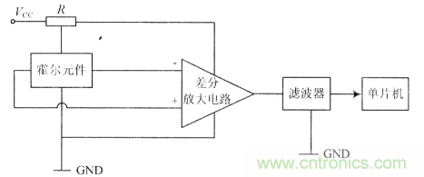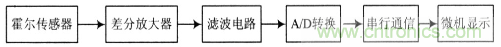 系統(tǒng)可以分為3個(gè)部分。第一部分是信號(hào)源,由霍爾傳感器產(chǎn)生電壓信號(hào),信號(hào)通過(guò)差分放大,濾波得到較清晰的信號(hào);第二部分是信號(hào)經(jīng)過(guò)A/D轉(zhuǎn)換送入單片機(jī)進(jìn)行處理,再通過(guò)串行通信送入PC機(jī)處理得到結(jié)果;第三部分是數(shù)據(jù)的顯示,這部分是通過(guò)VB的繪圖程序來(lái)完成,顯示結(jié)果以v-x關(guān)系圖來(lái)顯示。系統(tǒng)總流程如圖1所示。