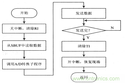 由于單片機(jī)多應(yīng)用于實(shí)時(shí)性較強(qiáng)的控制場(chǎng)合,為了盡量少占用CPU的時(shí)間,充分發(fā)揮CPU的功能。該系統(tǒng)在單片機(jī)程序設(shè)計(jì)中采用中斷方式與PC機(jī)進(jìn)行通信。主程序只進(jìn)行串行通信、數(shù)碼管實(shí)時(shí)顯示、模/數(shù)轉(zhuǎn)換結(jié)果的初始化和循環(huán)等待串行中斷工作,當(dāng)接收到PC機(jī)發(fā)來(lái)的信號(hào)時(shí),就轉(zhuǎn)人中斷服務(wù)程序,進(jìn)行A/D轉(zhuǎn)換,并向Pc機(jī)發(fā)送數(shù)據(jù)。中斷服務(wù)子程序流程圖如圖6所示。
