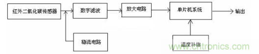 檢測(cè)電路由紅外二氧化碳傳感器、數(shù)字濾波電路、放大電路、穩(wěn)流電路、單片機(jī)系統(tǒng)、溫度補(bǔ)償?shù)冉M成。基本原理是紅外二氧化碳傳感器將檢測(cè)到的二氧化碳?xì)怏w濃度轉(zhuǎn)換成相應(yīng)的電信號(hào),輸出的電信號(hào)分別經(jīng)過(guò)濾波、放大處理,輸入到單片機(jī)系統(tǒng),并經(jīng)溫度和氣壓補(bǔ)償?shù)忍幚砗?,由單片機(jī)系統(tǒng)輸出送顯示裝置顯示其測(cè)量值。