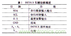 DS75LX工作電壓為1.7 V到3.7 V。除了基本的測(cè)溫功能外,DS75LX還具有溫度報(bào)警功能,允許用戶通過(guò)軟件設(shè)置報(bào)警溫度的門限值。DS75LX測(cè)溫范圍為-55℃~+125℃,當(dāng)測(cè)溫范圍為-25℃~+100℃時(shí),測(cè)量精度為±2℃。DS75LX同時(shí)具有可編程的9至12位的溫度數(shù)據(jù)輸出格式。輸出的溫度數(shù)據(jù)為12位時(shí),其分辨率可達(dá)0.0625℃。該傳感器具有三個(gè)地址引腳,可設(shè)置為三種狀態(tài)中的任意一種:接GND、VDD,或懸空,可設(shè)置27種地址組合。例如A2、A1和A0分別為接電源、接地和懸空時(shí),DS75LX的器件地址為0101110。圖1是DS75LX的引腳排列,各功能描述如表1所示。