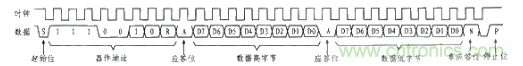 DX75LX的讀寫(xiě)操作是通過(guò)兩線串行總線接口實(shí)現(xiàn)的,該串行總線與I2C總線兼容。圖2所示為讀溫度及溫度門限寄存器的時(shí)序圖。此時(shí)假定寄存器指針已指向溫度寄存器,否則需要對(duì)指針進(jìn)行設(shè)置。設(shè)置方法如下:主器件產(chǎn)生起始位、發(fā)送包含DS75LX地址的寫(xiě)命令、收到應(yīng)答、發(fā)送寄存器指針字節(jié)。注意只有指針字節(jié)的低兩位(P1、P0位)有效。
