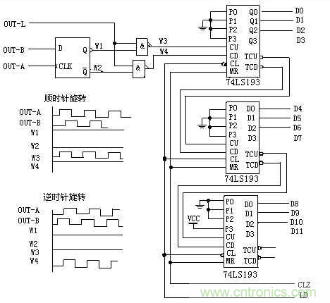 當(dāng)光電編碼器順時針旋轉(zhuǎn)時,通道A輸出波形超前通道B輸出波形90°,D觸發(fā)器輸出Q(波形W1)為高電平,Q(波形W2)為低電平,上面與非門打開,計數(shù)脈沖通過(波形W3),送至雙向計數(shù)器74LS193的加脈沖輸入端CU,進行加法計數(shù);此時,下面與非門關(guān)閉,其輸出為高電平(波形W4)。當(dāng)光電編碼器逆時針旋轉(zhuǎn)時,通道A輸出波形比通道B輸出波形延遲90°,D觸發(fā)器輸出Q(波形W1)為低電平,Q(波形W2)為高電平,上面與非門關(guān)閉,其輸出為高電平(波形W3);此時,下面與非門打開,計數(shù)脈沖通過(波形W4),送至雙向計數(shù)器74LS193的減脈沖輸入端CD,進行減法計數(shù)。