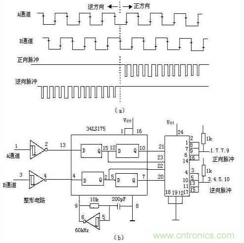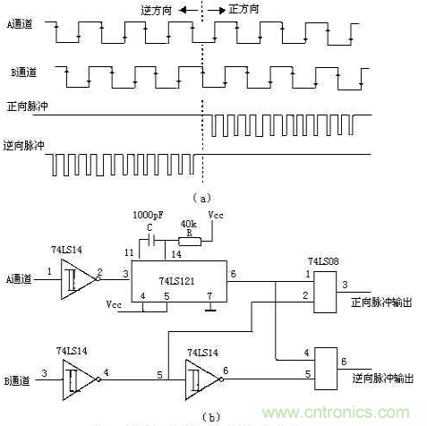 增量編碼器是以脈沖形式輸出的傳感器,碼盤比絕對編碼器碼盤要簡單得多且分辨率更高。一般只需要三條碼道,這里的碼道實際上已不具有絕對編碼器碼道的意義,而是產(chǎn)生計數(shù)脈沖。它的碼盤的外道和中間道有數(shù)目相同均勻分布的透光和不透光的扇形區(qū)(光柵),但是兩道扇區(qū)相互錯開半個區(qū)。當(dāng)碼盤轉(zhuǎn)動時,它的輸出信號是相位差為90°的A相和B相脈沖信號以及只有一條透光狹縫的第三碼道所產(chǎn)生的脈沖信號(它作為碼盤的基準位置,給計數(shù)系統(tǒng)提供一個初始的零位信號)。從A,B兩個輸出信號的相位關(guān)系(超前或滯后)可判斷旋轉(zhuǎn)的方向。由圖3(a)可見,當(dāng)碼盤正轉(zhuǎn)時,A道脈沖波形比B道超前π/2,而反轉(zhuǎn)時,A道脈沖比B道滯后π/2。圖3(b)是一實際電路,用A道整形波的下沿觸發(fā)單穩(wěn)態(tài)產(chǎn)生的正脈沖與B道整形波相‘與’,當(dāng)碼盤正轉(zhuǎn)時只有正向口脈沖輸出,反之,只有逆向口脈沖輸出。增量編碼器是根據(jù)輸出脈沖源和脈沖計數(shù)來確定碼盤的轉(zhuǎn)動方向和相對角位移量。通常,若編碼器有N個(碼道)輸出信號,其相位差為π/ N,可計數(shù)脈沖為2N倍光柵數(shù),現(xiàn)在N=2。圖3電路的缺點是有時會產(chǎn)生誤記脈沖造成誤差,這種情況出現(xiàn)在當(dāng)某一道信號處于‘高’或‘低’電平狀態(tài),另一道信號正處于‘高’和 ‘低’之間的往返變化狀態(tài),此時碼盤雖然未產(chǎn)生位移,但是會產(chǎn)生單方向的輸出脈沖。例如,碼盤發(fā)生抖動或手動對準位置時(下面可以看到,在重力儀測量時就會有這種情況)。