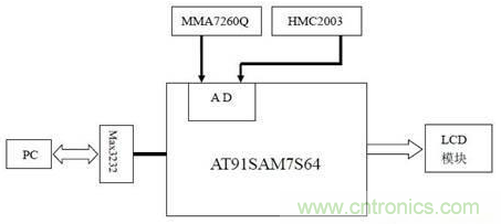 本系統(tǒng)的硬件結(jié)構(gòu)如圖2所示。由于At91sam7s64具有片上A/D轉(zhuǎn)換器而且具有8選1模擬復(fù)用器,使得MMA7620Q和HMC2003可以直接與微控制器相連而不必外加A/D轉(zhuǎn)換器和復(fù)用器,不僅降低了系統(tǒng)的成本和體積,提高了系統(tǒng)的集成度,同時(shí)減少了誤差源,提高了精度。經(jīng)過A/D轉(zhuǎn)換的測量數(shù)據(jù)經(jīng)過ARM核的處理后,被送到串口LCD并通過RS232接口送入PC機(jī)進(jìn)行進(jìn)一步的分析。