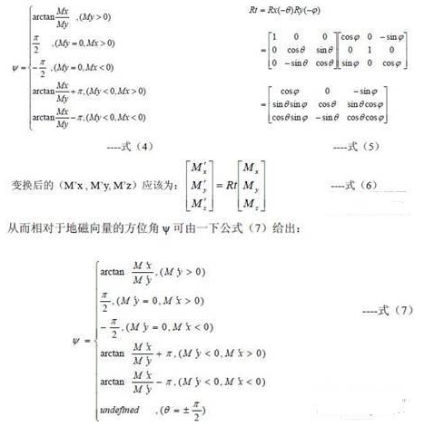 為了獲得系統(tǒng)相對(duì)于當(dāng)?shù)氐卮畔蛄康姆轿唤?,需要使用MR傳感器的三個(gè)輸出Mx, My, Mz.當(dāng)系統(tǒng)置于水平狀態(tài)時(shí)(俯仰角和橫滾角都為0)時(shí),方位角ψ可以由公式(4)直接給出,但是在大多數(shù)情況下,系統(tǒng)并不是工作在水平狀態(tài),此時(shí)地磁場的豎直分量將會(huì)影響Mx和My的值,因此不能直接由公式(4)獲得相對(duì)于地磁向量的方位角。為了在所有情況下都能獲得正確的方位角,必須將俯仰角和橫滾角考慮在內(nèi),即必須通過以俯仰角和橫滾角為參數(shù)的坐標(biāo)變換,將測得的(Mx, My, Mz)向量變換為與載體坐標(biāo)系有相同方位角的水平坐標(biāo)系下的向量(M‘x , M’y, M‘z),其變換矩陣如公式(5)。
