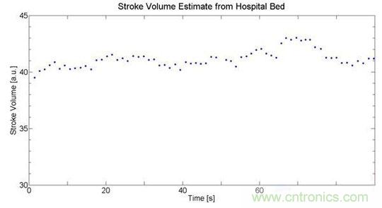 通過(guò)先進(jìn)的濾波算法,可以從病床的諧振與噪聲中分離出心搏圖數(shù)據(jù),如圖4估算出的心率和搏量,其中的血搏量是不帶單位的數(shù)據(jù),它需要進(jìn)行標(biāo)定才能等到一個(gè)絕對(duì)值。圖4中的搏量變異性估算得相當(dāng)準(zhǔn)確,它可以用于估算呼吸率。