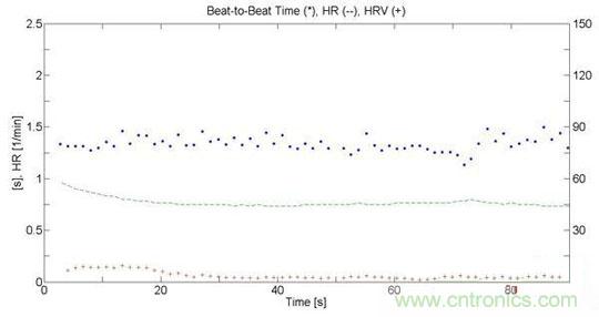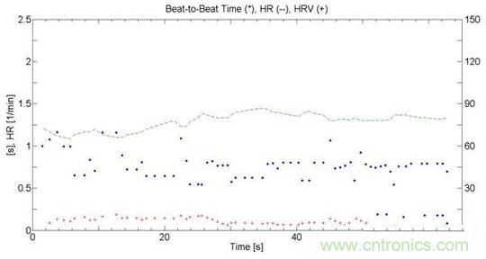 圖4中的點(diǎn)與點(diǎn)之間的時(shí)間就是心臟跳動(dòng)的時(shí)間,心率及心率變異性可以從中計(jì)算出來(lái),如圖5。村田的工程師也在電子稱(chēng)上使用SCA61T測(cè)量出相同的心搏圖數(shù)據(jù),當(dāng)然,在電子稱(chēng)上因?yàn)槿说倪\(yùn)動(dòng),噪聲更大,如圖六。