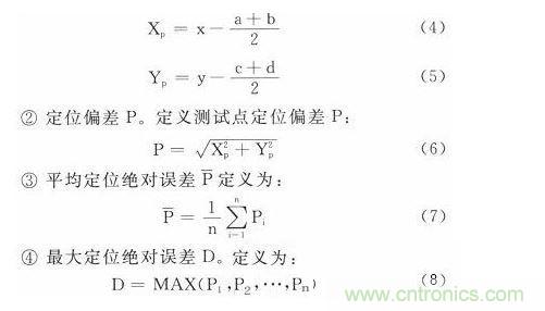 ①偏差Xp、Yp。假設(shè)在物理平臺上測試點(diǎn)的網(wǎng)格坐標(biāo)取值范圍為X∈[a,b],Y∈[c,d](a、b、c、d為非負(fù)整數(shù),b-a=d-c=1,單位為cm)通過軟件求得的坐標(biāo)為(x,y),定義偏差Xp、Yp: