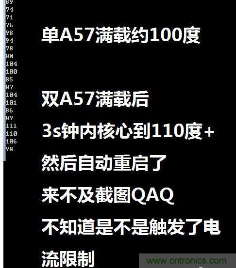那么810的功耗有多高呢,根據(jù)貼吧大神(炮神)ioncannon的分析,在Z9 Max上,810的單核心功耗最高可以達(dá)到5W(注意是單核心!單核心!單核心! 重要的事情要說三遍),雙核A57同時(shí)滿載3S就發(fā)熱達(dá)到110攝氏度,并自動(dòng)重啟了,想測試下雙核的功耗都以為爆機(jī)沒辦法測試了。