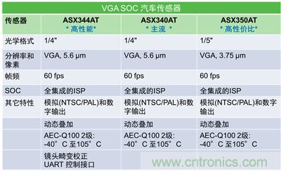 ASX344/340/350AT是用于倒車(chē)影像的系統(tǒng)級(jí)芯片(SoC),在單芯片上集成圖像信號(hào)處理器,增強(qiáng)的像素性能提供微光條件下的更高能見(jiàn)度,支持高達(dá)4層的圖像疊加以向顯示系統(tǒng)提供更多的倒車(chē)信息,支持?jǐn)?shù)字縮放和平移,并附加光學(xué)中心點(diǎn)矯正功能,這可為客戶(hù)提供相機(jī)組裝生產(chǎn)后鏡頭中心點(diǎn)矯正功能,從而節(jié)省成本。這三款圖像傳感器都完全通過(guò)AEC-Q100認(rèn)證,并具備-40°C至105°C的寬工作溫度范圍,它們的不同之處在于:ASX344AT還集成魚(yú)眼畸變校正功能和提供UART控制接口,定位為“高性能”的方案;ASX350AT的光學(xué)格式為1/5英寸,不同于A(yíng)SX344/340AT的1/4英寸,定位為“高性?xún)r(jià)比”的方案;而ASX340AT定位為“主流”方案。設(shè)計(jì)人員可根據(jù)目標(biāo)客戶(hù)的具體需求選擇有針對(duì)性的方案。