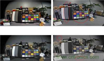 ASX34xAT系列在白天(典型情況為100-200lux明亮的光)和夜晚(典型情況為汽車(chē)倒車(chē)攝像頭在夜晚約10lux使用剎車(chē)燈和倒車(chē)燈)都較同類(lèi)競(jìng)爭(zhēng)器件提供更好的色彩飽和度和對(duì)比度,如圖2紅圈所示,在白天180lux的光照條件下,競(jìng)爭(zhēng)器件采集到的圖像過(guò)度銳化,且色彩邊界有灰斑;在夜晚微光9.5lux的光照條件下,競(jìng)爭(zhēng)器件采集到的圖像過(guò)度銳化,且有更多的噪聲。