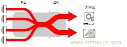 前置機(jī)器視覺攝像頭更是需要多個副本,但它將很快適用于自主車輛的附加攝像頭、雷達(dá)和光線檢測/測距(LIDAR)傳感器。數(shù)據(jù)記錄是一個當(dāng)今非常常見的復(fù)制應(yīng)用(圖1)。在機(jī)器視覺應(yīng)用中,通常記錄某些行車狀況的原始傳感器數(shù)據(jù),以用于未來分析。這種情況下,擁有聚合原始傳感器數(shù)據(jù)的第二副本,并將其用于數(shù)據(jù)記錄,是大有裨益的;而另一個副本則用于機(jī)器視覺處理。