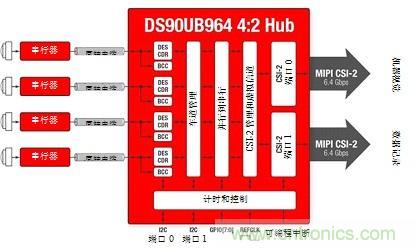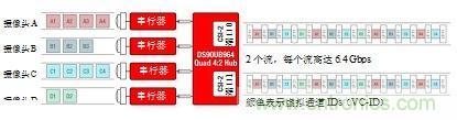 圖3所示為四攝像頭系統(tǒng),具有由彩色塊所示的不同數(shù)據(jù)速率。聚合數(shù)據(jù)在移動工業(yè)處理器接口(MIPI)攝像頭串行接口(CSI)-2端口0和1兩者處呈現(xiàn)。CSI-2總線具有“突發(fā)性”,意味著其以固定數(shù)據(jù)速率運(yùn)行、將發(fā)送數(shù)據(jù)為可用狀態(tài),并且當(dāng)機(jī)器空閑時恢復(fù)到低功率(LP)狀態(tài)。因此,傳感器速度可在不改變ECU處理器時序的條件下進(jìn)行變化。即使傳感器鏈路以獨(dú)立頻率運(yùn)行,解串器集線器在單個參考時鐘上也可將數(shù)據(jù)提供給片上系統(tǒng)(SoC)處理器,從而簡化系統(tǒng)時序。