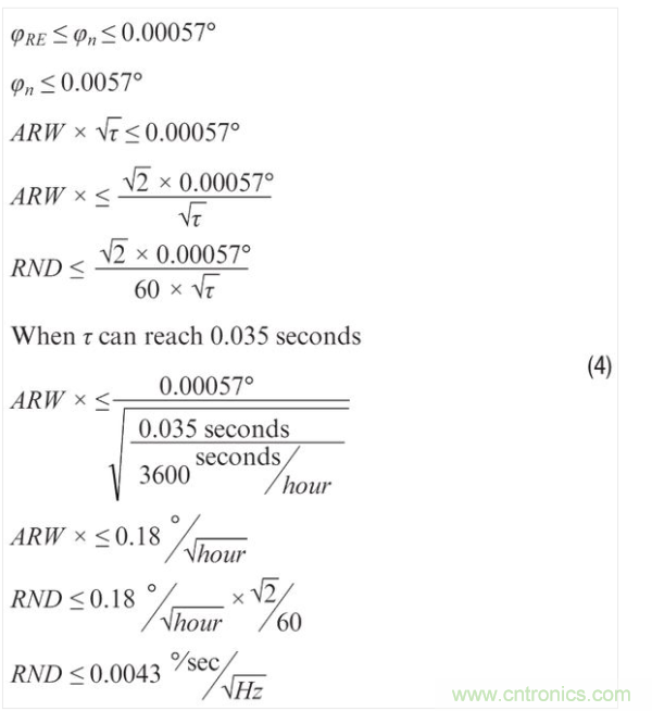 公式4將公式3的結(jié)果和公式2中的一般關(guān)系相結(jié)合,用來(lái)預(yù)測(cè)特定情況下對(duì)MEMS陀螺儀的ARW和RND要求。該過(guò)程假設(shè)圖像捕捉時(shí)間35 ms等于公式2中的積分時(shí)間 (τ),因而可以預(yù) 測(cè),為了達(dá)到要求,陀螺儀的ARW需要小于0.18°/ hr,或者RND必須小于0.0043°/sec/ Hz。當(dāng)然,這可能不是這些參數(shù)支持的唯一要求,但這些簡(jiǎn)單的關(guān)系提供了一個(gè)例子,告訴我們?nèi)绾螌⑵渑c已知要求和條件聯(lián)系起來(lái)。