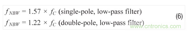 當(dāng)RND的頻率響應(yīng)遵循單極點(diǎn)或雙極點(diǎn)低通濾波器曲線時(shí), 噪聲帶寬 (fNBW) 和濾波器截止頻率 (fC) 將有公式6的關(guān)系。