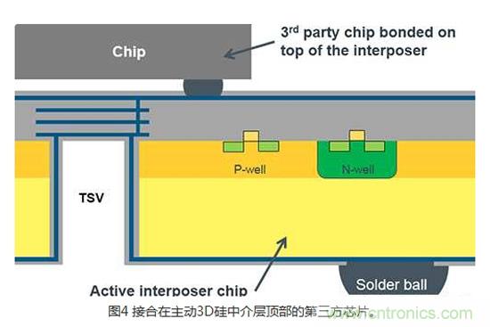 3DIC技術(shù)的另一個變化和極為創(chuàng)新的發(fā)展,是硅中介層架構(gòu)(Silicon interposer architecture)。 所謂的被動3D硅中介層是用來產(chǎn)生一個從芯片的頂端到底部的簡單電氣連接。 所謂的主動3D硅中介層能支持實(shí)現(xiàn)完整CMOS設(shè)計(jì)所需制程技術(shù)的所有被動和主動組件。