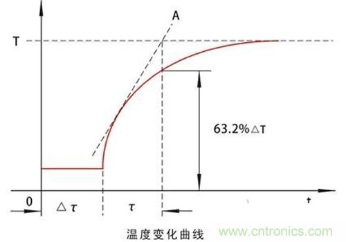 實踐證明熱電偶、熱電阻、雙金屬溫度計當(dāng)被測溫度突然發(fā)生變化時,其輸出會延遲一段時間,這段延遲時間△τ一般叫做純滯后或純時延。在延遲△τ后,會以近似于指數(shù)曲線的規(guī)律變化(如下圖所示),如忽略△τ,并以介質(zhì)溫度變化做計時起點(diǎn),則上述曲線符合T=△T(1-e-t/τ),此式中T為溫度;△T為溫度變化;t為時間;τ為時間常數(shù)。時間常數(shù)及時反應(yīng)曲線起點(diǎn)的切線與平衡溫度交點(diǎn)A所對應(yīng)的時間,也就是輸出變化63.2%△T所需要的時間。