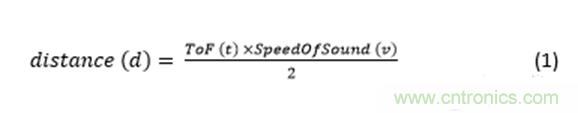 距離(d)是從無(wú)人機(jī)上的超聲波傳感器到地面/物體的距離,ToF(t)是前面定義的ToF,而SpeedOfSound(v)是通過(guò)介質(zhì)的聲速。ToF(t)×SpeedOfSound(v)除以2,因?yàn)門oF計(jì)算超聲回波往返物體的時(shí)間。