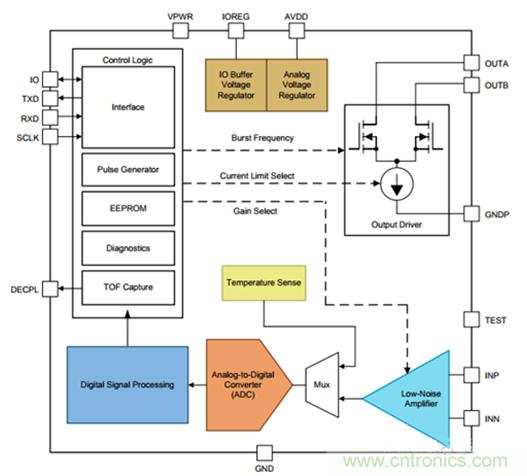 超聲波傳感技術(shù)也是一項(xiàng)具有成本競(jìng)爭(zhēng)力的技術(shù),特別是在使用PGA460等集成解決方案時(shí),其中已包括大部分所需的芯片。PGA460既可以使用半橋或H橋直接驅(qū)動(dòng)傳感器,也可以使用變壓器驅(qū)動(dòng)傳感器;后者主要用于密封的的“密閉”傳感器。PGA460還包括用于接收和調(diào)節(jié)超聲回波的完整模擬前端。此外,該器件還可以通過(guò)數(shù)字信號(hào)處理來(lái)計(jì)算ToF(見(jiàn)圖4)。
