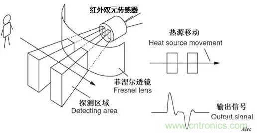 被動紅外傳感器包含兩個(gè)互相串聯(lián)或并聯(lián)的熱釋電元。而且制成的兩個(gè)電極化方向正好相反,環(huán)境背景輻射對兩個(gè)熱釋電元幾乎具有相同的作用,使其產(chǎn)生釋電效應(yīng)相互抵消,于是探測器無信號輸出。