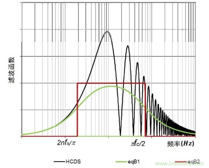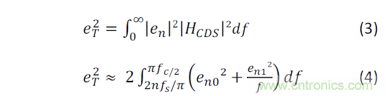 在算式中,fs 是采樣頻率, n是CDS 因子(通常n=2)。如圖3顯示,取決于采樣頻率,這一濾波或多或少地去除1/f噪聲頻率成分,尤其是當(dāng)采樣頻率fs很高的時候 顯著(換句話說,電荷進(jìn)出“陷阱”的動作將慢于CDS頻率)。HCDS濾波器結(jié)合放大鏈的低通濾波器可以簡化為一個如圖3所示的等效帶通濾波器。圖中的eqBP1 對應(yīng)一個一級帶通濾波器。這裡eqBP1的噪聲頻譜函數(shù)要除以2,以得到一個帶有HCDS函數(shù)的等效集成噪聲功率 。eqBP2 是eqBP1的陷波估算值。要取得集成噪聲功率,eqBP2 的上限和下限分別按照下列算式進(jìn)行倍增: