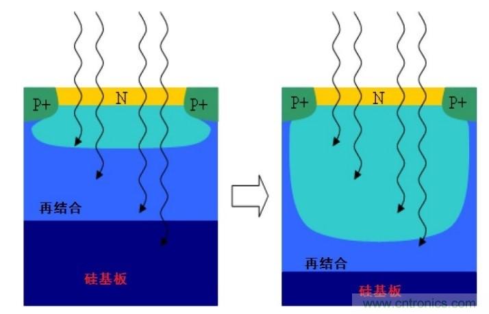 因為這個原因,ITCCD不能從BSI中獲益。而高端CCD因為使用垂直抗暈工藝,所以沒有這一限制。而CMOS也具有同一特點:在薄的感測層上,因為電荷不會在像素之間滲透,所以沒有串?dāng)_的缺點。結(jié)果是ITCCD和標(biāo)準(zhǔn)CIS都能夠?qū)崿F(xiàn)良好的空域解析度或調(diào)制轉(zhuǎn)換函數(shù)(modulated transfer function,MTF) 。要增加NIR部份和敏感度,需要顯著增加物料厚度,但是厚物料會增加光電串?dāng)_,引致MTF衰減。成像質(zhì)量是MTF和QE的綜合結(jié)果(即所謂的檢測量子效率Detective Quantum Efficiency,DQE),所以必需同時考量空域和時域因素。圖6顯示利用硅摻雜方法恢復(fù)MTF的深耗盡(deep depletion)光電二極管。一般來說,CIS使用類似集成電路的常用技術(shù)(特別是DRAM/內(nèi)存工藝)生產(chǎn),所以不會牽涉上述的特定工藝配方。不過近期的技術(shù)研究文章展示適用于CIS的特定工藝導(dǎo)入方案,能實現(xiàn)出色的QE改進(jìn)甚至相對接近高端CCD的水平(見圖5)。最新的CMOS技術(shù)趨勢可說是突飛猛進(jìn),引進(jìn)了如導(dǎo)光板、深槽隔離(deep trench isolation,DTI)、埋藏微透鏡,以及在光敏范圍下嵌入包含像素晶體管的迭層芯片等技術(shù)。