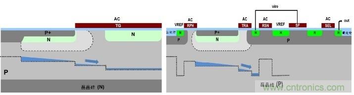 “嵌入式光電二極管” (pinned photodiode,PPD) 或“空穴堆積二極管”(hole accumulation diode,HAD) 最初開發(fā)目的是消除延遲并把全部電荷從光電二極管轉(zhuǎn)移到ITCCD寄存器[12]。CMOS圖像傳感器的一個重大發(fā)展是在2000年代初期引進(jìn)ITCCD光電二極管結(jié)構(gòu)[11],如圖7所示。在CMOS中,像素結(jié)構(gòu)多數(shù)以每像素的晶體管數(shù)目來表示。大部分 CMOS圖像傳感器傾向使用電子卷簾快門(electronic rolling shutter),這有助于集成并只需少至三個晶體管 (3T)就能實現(xiàn)。雖然有結(jié)構(gòu)簡單的優(yōu)點,3T像素結(jié)構(gòu)的缺點是電路來自kT/C (或溫度) 噪聲的像素生成時域噪聲會較大,而且不能輕易消除。